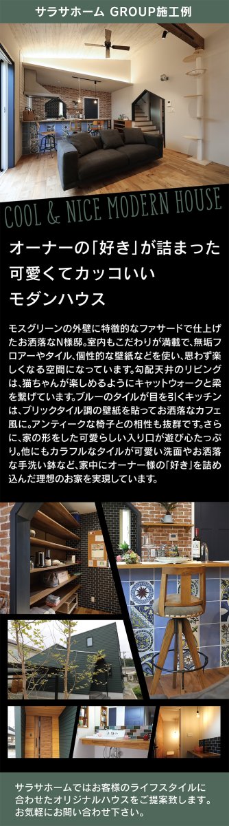 モスグリーンの外壁と個性豊かな内装が魅力のN様邸。キャットウォーク付きリビングやカフェ風キッチン、遊び心ある造作が随所に光る理想の住まいです。