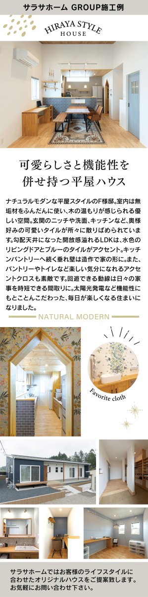 無垢材の温もり溢れるナチュラルモダンな平屋F様邸。可愛いタイルやアクセントクロス、回遊動線や太陽光発電など機能性も充実し、快適で楽しい暮らしを実現。